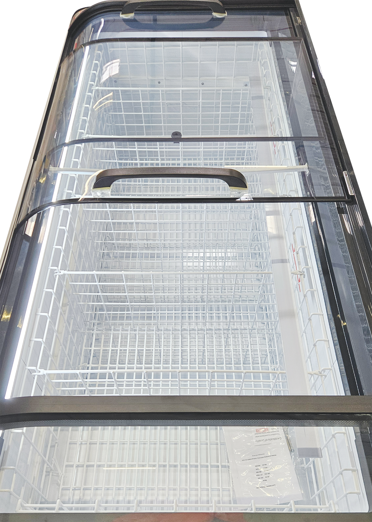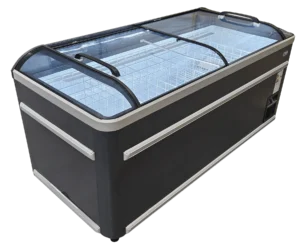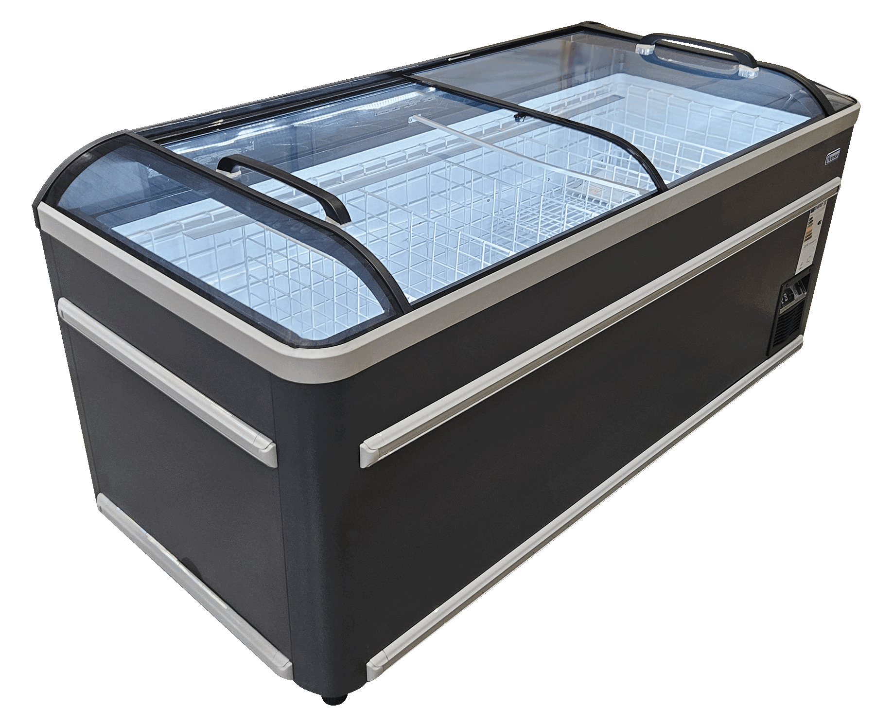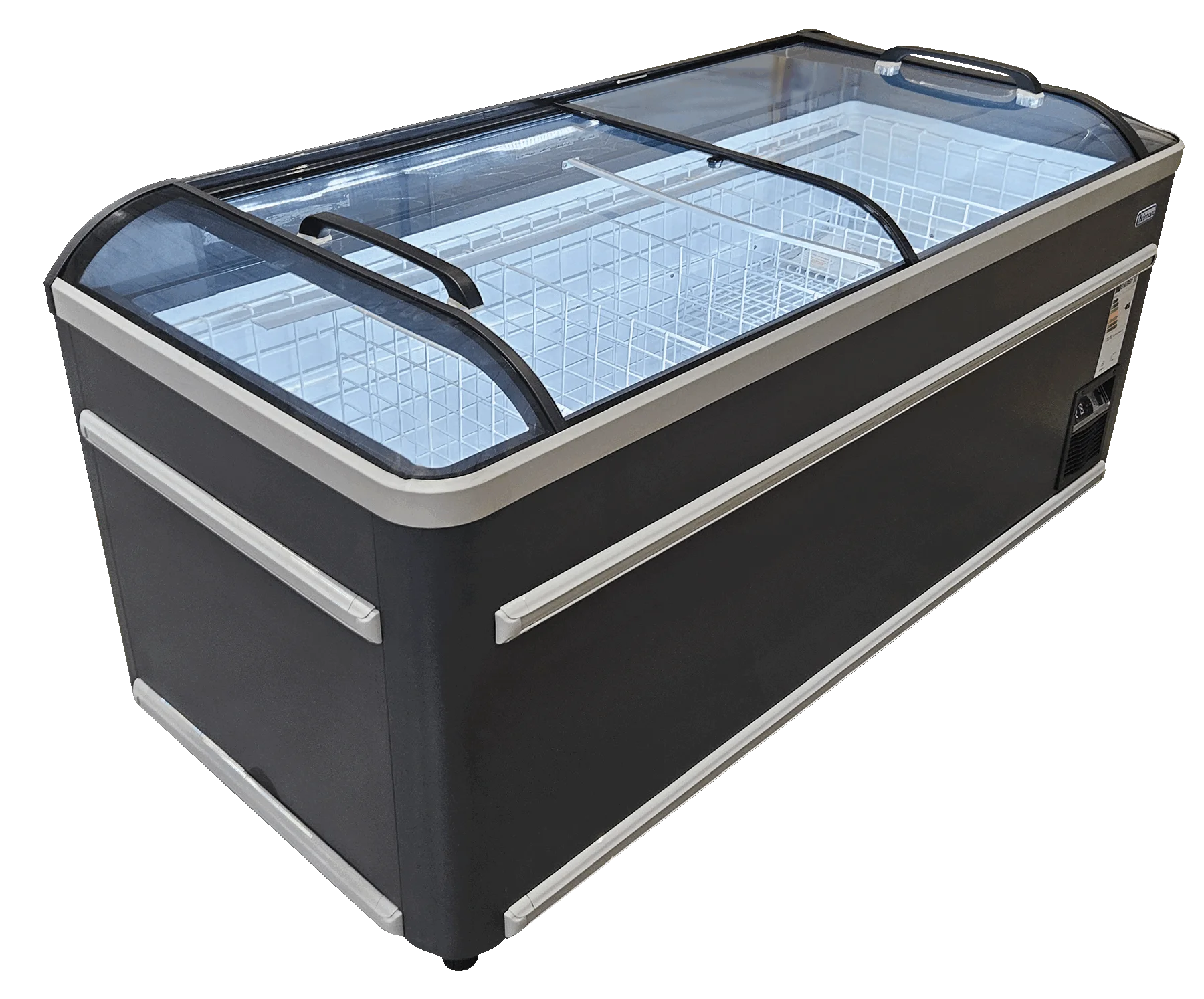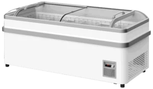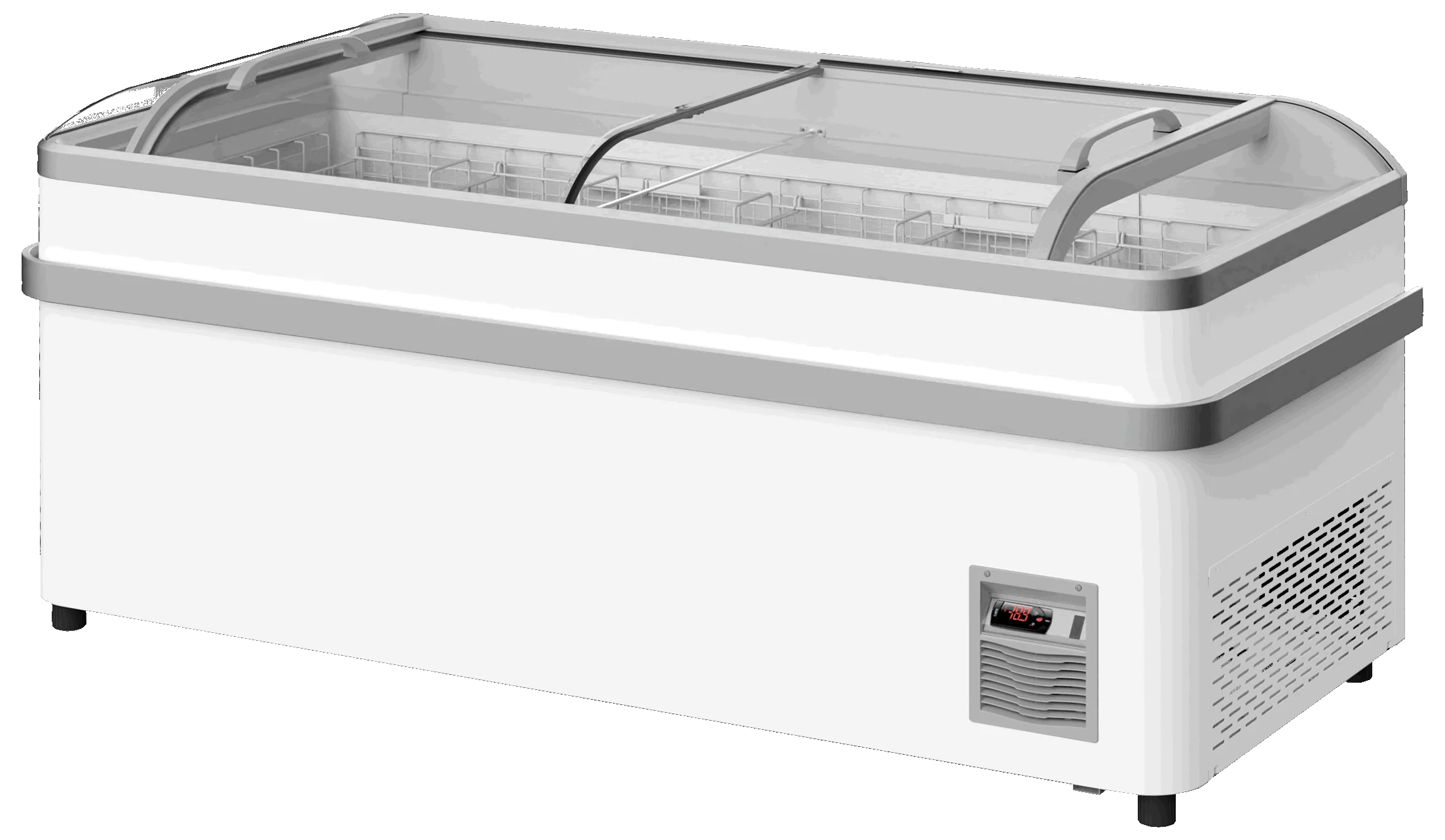 ZAMRAŻARKA ekspozycyjna przeznaczona dla większych sklepów i supermarketów, służąca do przechowywania lodów i żywności mrożonej z wypukłymi, przesuwnymi szybami, wyposażona w standardzie w kontroler elektroniczny z cyfrowym wyświetlaczem temperatury oraz oświetlenie LED.