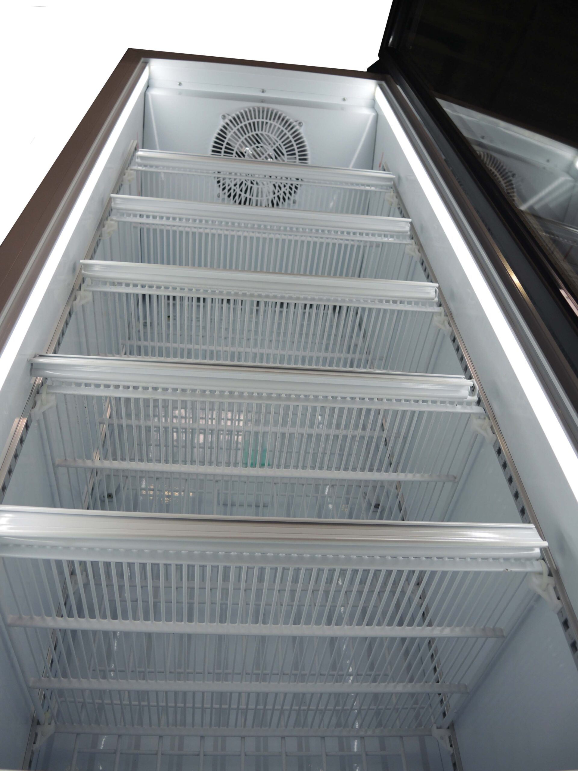 Zamrażarka jest znakomicie doświetlona w środku dzięki zastosowaniu energooszczędnego rozwiązania w postaci dwóch pasków LED-owych, zamontowanych po obu stronach powierzchni ekspozycyjnej.